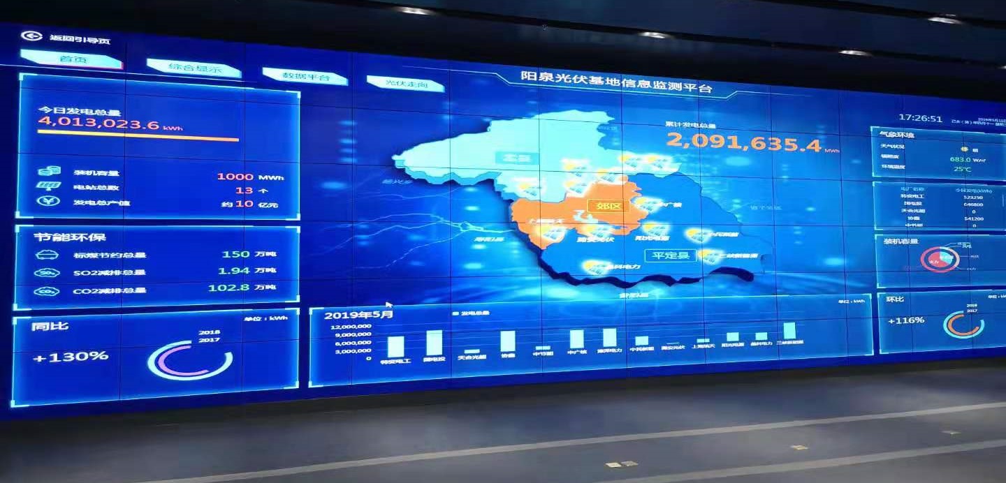 信息平臺(tái)匯集了光伏領(lǐng)跑者項(xiàng)目十三家投資商的實(shí)時(shí)發(fā)電數(shù)據(jù)、地理位置、具體信息。整個(gè)項(xiàng)目裝機(jī)容量為1000MW(兆瓦),年發(fā)電總產(chǎn)值約10億元。以及在建和列入開發(fā)方案的共計(jì)48萬(wàn)千瓦風(fēng)電項(xiàng)目。為拓寬平臺(tái)的服務(wù)領(lǐng)域,實(shí)現(xiàn)平臺(tái)的綜合化利用,該平臺(tái)除實(shí)現(xiàn)對(duì)光伏基地整體運(yùn)行情況的實(shí)時(shí)監(jiān)測(cè)外,還可以通過(guò)可視會(huì)議系統(tǒng),實(shí)時(shí)連線重點(diǎn)工程情況。